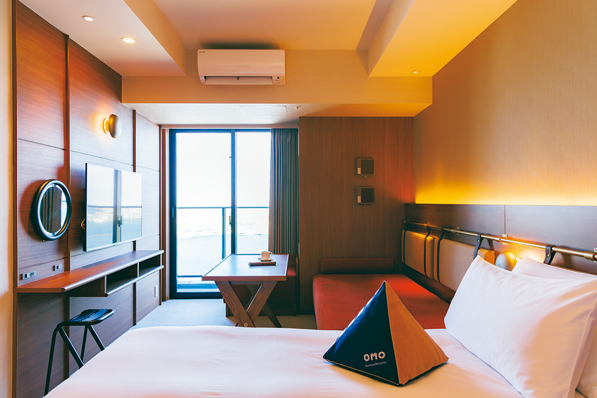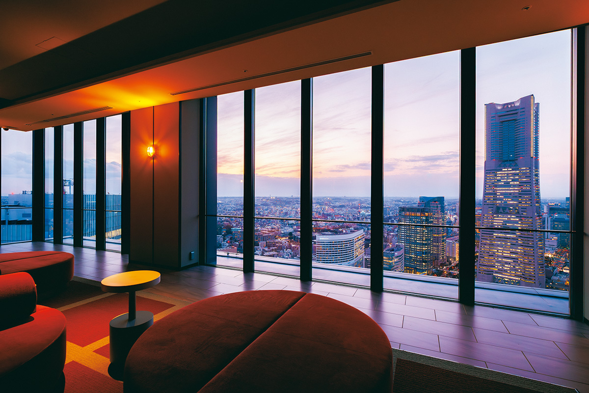 ホテルのフロントがあるのは46階。回廊式のパブリックスペース「OMOベース」に到着した途端、上空から見おろす港町・横浜の景色に圧倒される。窓に沿ってぐるりと歩くと、横浜港やベイブリッジ、歴史的建造物が並ぶ馬車道の街並み、遠く彼方に富士山などを一望することが可能だ。ここから、ホテルが掲げる〝360°天空のボヤージュ〞が始まる。操舵室を模したフロントやマリンモチーフの装飾、ビリヤード台などがある「Play Zone」、映画鑑賞ができる「シアタールーム」があるほか、キャビンをイメージしたデザインの客室も船旅気分を盛り上げる。夜、客室でのリラックスタイムは、バルコニーでしばし過ごしてみてはいかが? 港から吹く心地よい風と、時折聞こえてくる大型客船の汽笛の音が、夢見心地の特別なホテル時間へと誘う。