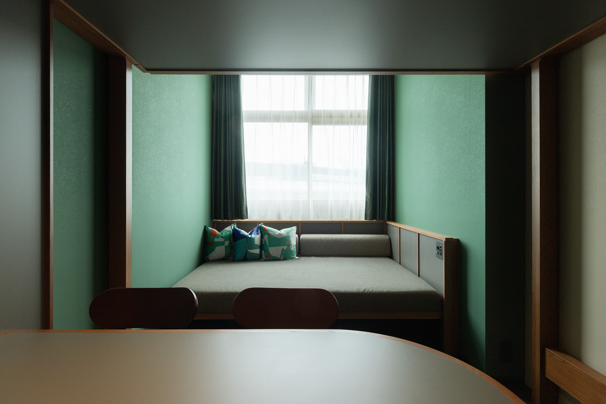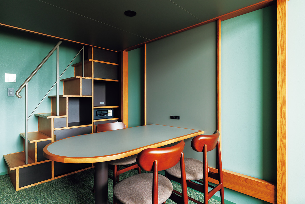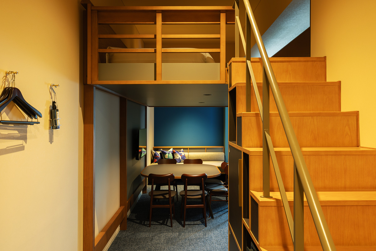 議案の採決などを行った、本会議場の議員席や絨毯に使用していた緑色がテーマカラーの客室。3名定員でコンパクトな造りの「やぐらルーム」は、ロフトスペースにベッドルームがある。観光や食事を街で楽しむアクティブ派の拠点とするのに最適。