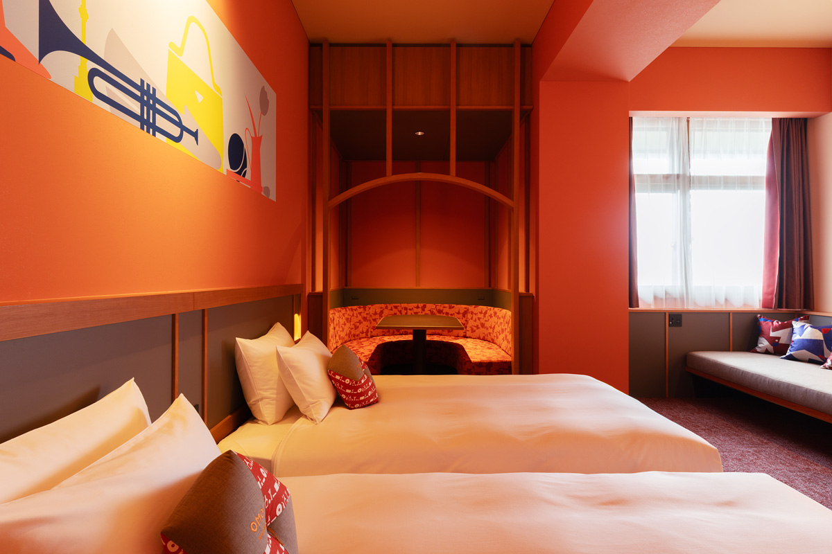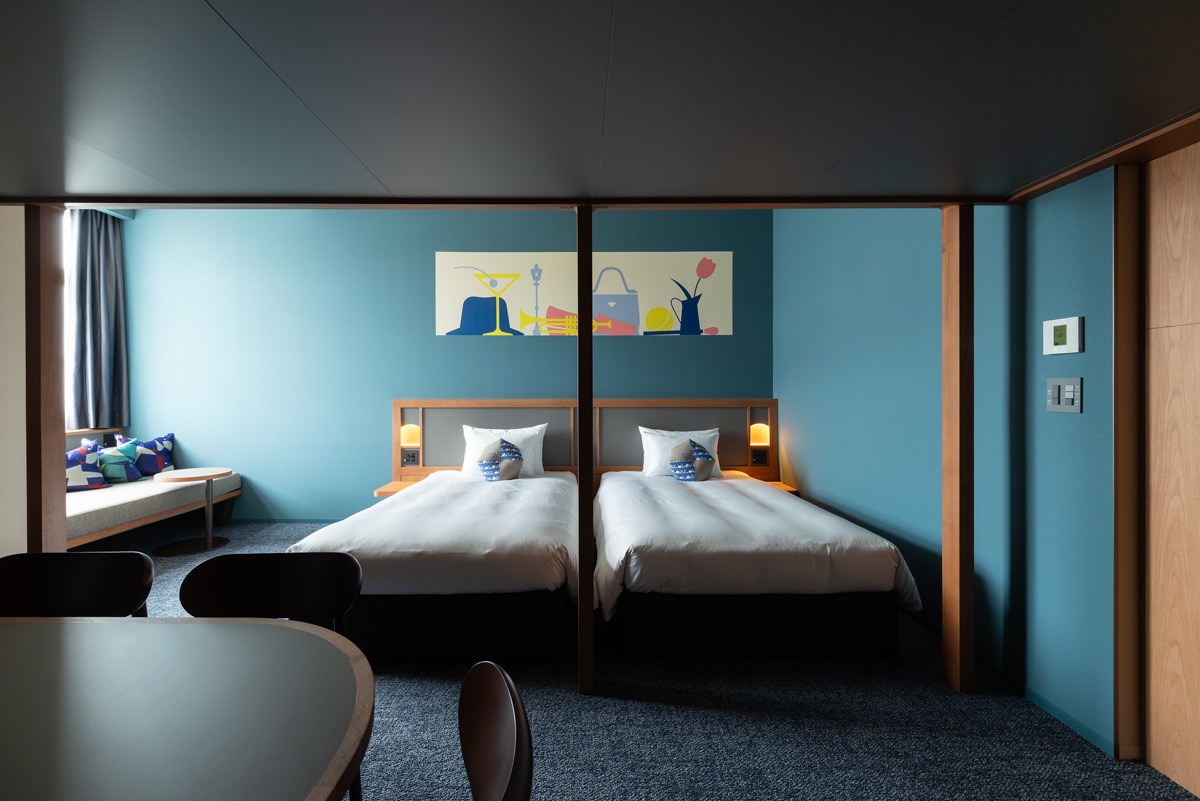 旧市庁舎で使用されていたタイルや絨毯を参考に、〈OMO7横浜〉の全客室にカラーを設定。青、赤、緑、いずれも気持ちやすらぐ空間。